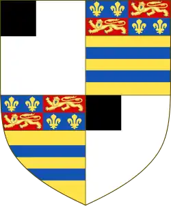 Escutcheon: Quarterly, 1st & 4th: Argent, a canton sable (Sutton) 2nd & 3rd: Or, two bars azure, a chief quarterly azure and gules, the 1st and 4th quarters charged with two fleurs-de-lis or, and the 2nd and 3rd a lion of England (Manners) |