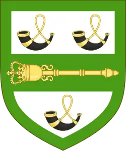 Escutcheon: Argent on a fess Vert between three bugle-horns Sable stringed Or a representation of the Speaker's Mace in fess head to the dexter Or a bordure Vert. |