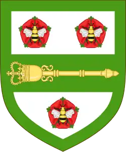 Escutcheon: Argent on a Fess conjoined to a Bordure Vert and between three Roses Gules barbed proper each charged with a Bee volant Or striped Sable winged Argent the House of Commons Mace fesswise Or |