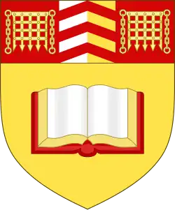 Escutcheon: Or an open book proper bound Sable garnished Gules. On a chief of the last between two portcullises Or a pale per pale Argent and Or, charged with three chevrons gules. |