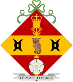 Escutcheon: Gules, a representation of the mace of the Speaker of the House of Commons palewise Or surmounted in base by a rose Argent barbed and seeded Proper over all on a fess Gold an owl guardant Proper between two millrinds Sable.[53][54][55][47] |