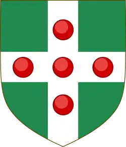 Crest: Out of a crown vallary Or a leopard's head Argent semée of escallops and gorged with a collar gemel Gules. |