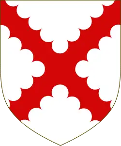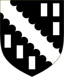 Escutcheon: Barry nebully of six Argent and Gules a bordure Sable bezanty.[2] |