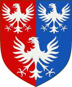 Escutcheon: Party per pale Gules and Azure three eagles displayed Argent. |