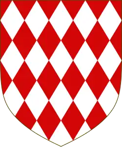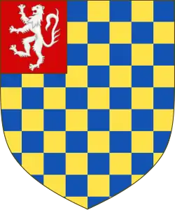 Escutcheon: Chequy Or and Azure on a canton Gules a lion rampant Argent. |
