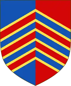 Escutcheon: Per pale Azure and Gules three chevronels Or voided and counterchanged. |