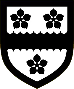 Escutcheon: Argent a fess engrailed between three cinquefoils Sable within a bordure of the last. |