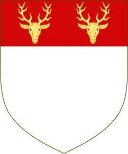 Escutcheon: Argent on a chief Gules two bucks' heads cabossed Or. |