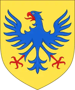 Escutcheon: Or an eagle displayed pruning its wings Azure with beak and bill Gules. |
