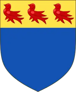 Escutcheon: Azure on a chief Or three martlets Gules. |