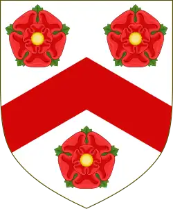 Escutcheon: Argent a chevron Gules between three roses Proper. |