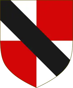 Escutcheon: Quarterly Argent and Gules a bend Sable. |