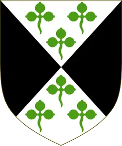 Escutcheon: Per saltire Argent and Sable in chief three trefoils slipped Vert two and one in base one and two of the last. |