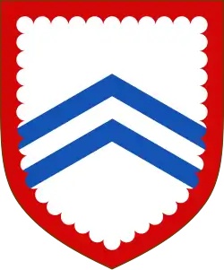 Escutcheon: Argent two chevrons Azure a bordure engrailed Gules. |