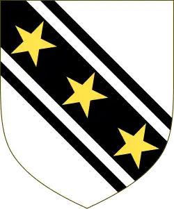 Escutcheon: Argent on a bend cotised Sable three mullets Or. |