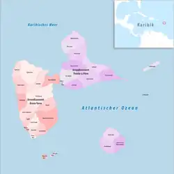 The arrondissements of Basse-Terre and Pointe-à-Pitre were established in 1947.[2] The arrondissement of Saint-Martin-Saint-Barthélemy, containing the communes of Saint-Martin and Saint-Barthélemy, was created in 1963 from part of the arrondissement of Basse-Terre.[3] This arrondissement was disbanded when Saint-Martin and Saint-Barthélemy became separate overseas collectivities in February 2007.[4]