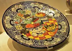 The Mexican pottery is a type of majolica (faience) or tin-glazed earthenware, with a white base glaze typical of the type.[2] It is made in the town of San Pablo del Monte in the state of Tlaxcala and the cities of Puebla, Atlixco, Cholula, and Tecali in the state of Puebla. Pottery is made in these locations because of the quality of the natural clay found there and the tradition of production which goes back to the 16th century.[3] Much of this pottery was decorated only in blue, but colors such as yellow, black, green, orange and mauve have also been used.[4] Majolica pottery was brought to Mexico by the Spanish in the first century of the colonial period. Production of this ceramic became highly developed in Puebla because of the availability of fine clays and the demand for tiles from the newly established churches and monasteries in the area. The industry had grown sufficiently that by the mid-17th century, standards and guilds had been established which further improved the quality, leading Puebla into what is called the "golden age" of Talavera pottery (from 1650 to 1750).[3] Formally, the tradition that developed there is called Talavera Poblana to distinguish it from the similarly named Talavera pottery of Spain. It is a mixture of Italian, Spanish and indigenous ceramic techniques.[2]