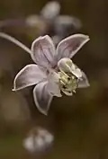 Asclepias cinerea is a perennial herb that is grass-like in appearance with a thin, smooth stem that reaches 2 ft (0.61 m) in height. Leaves are 2 to 4 in (51 to 102 mm) long, linear, narrow, glabrous, and oppositely arranged. Flowers are sparse and loosely arranged in axillary or terminal umbels. Each flower has a five-lobed corolla (petals) that are flat or reflexed and range from ashy-gray, pale violet, to pale rose. The fruit is a follicle that is smooth, slender, and 3 to 4 in (76 to 102 mm) long. When the follicle matures, it splits open releasing seeds. Each seed has white fluffy hairs (pappus) attached that aid in wind dispersal.[3][4]