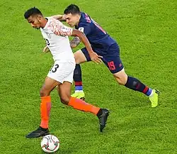 Kuruniyan have represented India in the under-18 and under-19 levels.[43] He got his senior national team call-up, when he was selected for the Indian squad for the 2018 Intercontinental Cup following his standout performance in the 2017–18 ISL season.[44] He made his national debut in the opening match of the tournament against Chinese Taipei as a substitute for Halicharan Narzary on 1 June 2018, which ended in a staggering 5–0 victory for India.[45] He also played in the final of the 2018 Intercontinental Cup against Kenya as a substitute for Udanta Singh on 10 June 2018, which India won 2–0, thereby winning the first edition of the Intercontinental Cup and helping Kuruniyan to win his first international title[46] Kuruniyan was in the squad to travel to Bangladesh for the 2018 SAFF Championship.[47] He scored his debut goal for the national team in the match against Sri Lanka on India's first match of the tournament on 5 September 2018, where scored the opening goal as India won the match 2–0 at full-time.[48] He also featured in India's 2–1 defeat in the final against Maldives on 15 September.[49][50] Kuruniyan was a part of Indian squad to compete in the 2019 AFC Asian Cup.[51] He played all three group stage matches, including India's opening match against Thailand on 6 January 2019, which India won 1–4, thereby witnessing India's first victory in the Asian Cup in 55 years,[52] and also became a part of India's largest win in their Asian Cup history.[53] He also played the do-or-die match on 14 January against Bahrain, which India lost 0–1 after Bahrain converted an injury time penalty into a goal, resulting in India's elimination from the tournament.[54] Months later, India announced their squad for the 2022 FIFA World Cup qualifiers, where Kuruniyan was included.[55] He played his first of the qualifiers against Oman on 5 September, which ended 1–2 to Oman.[56]
