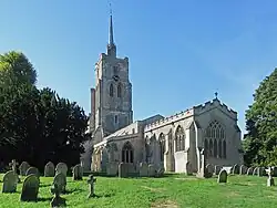 The parish church of St Mary the Virgin dates almost entirely from the 14th century and is renowned for its ornate church tower which stands at 176 feet (54 m), and is crowned by an octagonal lantern with a leaded 'spike'.[2] The church contains medieval graffiti carved on its walls which highlight the plight of survivors of the bubonic plague pandemic known as the Black Death. There is also a graffito depiction of Old St Paul’s Cathedral.