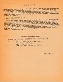 "[The AAPA] is a people's alliance to effect social and political changes. We believe that the American society is historically racist and one which has systematically employed social discrimination and economic imperialism, both domestically and internationally, exploiting all non-white people in the process of building up their affluent society...The goal of AAPA is political education and advancement of the movement among Asian people, so that they may make all decisions that affect their own lives."[9]
