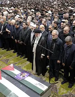 A funeral was held for Haniyeh at Tehran University on 1 August, with Iran's Supreme Leader Ali Khamenei leading prayers.[36] From there, the bodies of Haniyeh and his bodyguard were taken on a five-kilometer procession to Azadi Square.[37] Haniyeh's remains were then taken to Qatar for a ceremony at the Imam Muhammad ibn Abd al-Wahhab Mosque followed by burial in Lusail on 2 August.[38] Among those who attended the ceremony in Qatar were the Qatari Emir Sheikh Tamim bin Hamad Al Thani, Turkish Vice-president Cevdet Yilmaz and Foreign Minister Hakan Fidan, and Hamas political bureau member Khalil al-Hayya. Diplomatic delegations from Pakistan and Malaysia were also present, as well as representatives from Fatah and the Palestinian Islamic Jihad.[39][40][41]