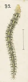 It is somewhat stout, slightly tapering at each end. The head and first segment are pale brown and horny; the rest of the body being pale greenish-ochreous. Each segment is provided with eight black warts arranged in two rows consisting of two and six respectively. Each of these warts gives rise to a small black bristle. The length of the larva when full-grown is about 1 inch.[6]