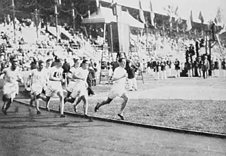 The men's 800 metres was a track and field athletics event held as part of the athletics at the 1912 Summer Olympics programme. It was the fifth appearance of the event, which is one of 12 athletics events to have been held at every Summer Olympics. The competition was held from Saturday, July 6, 1912, to Monday, July 8, 1912.[1] Forty-seven runners from 16 nations competed.[2] NOCs could enter up to 12 athletes.[3] The event was won by Ted Meredith of the United States, the nation's third consecutive victory in the 800 metres. Mel Sheppard became the first man to win two medals in the event, coming in second to miss out on defending his 1908 gold. Ira Davenport completed the United States sweep, the second time the Americans had swept the 800 metres podium (after 1904).