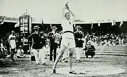 The men's discus throw was a track and field athletics event held as part of the athletics at the 1912 Summer Olympics programme. The competition was held on Friday, July 12, 1912. Forty-one discus throwers from 15 nation competed.[1] NOCs could enter up to 12 athletes.[2] The event was won by Armas Taipale of Finland, the nation's first medal in the men's discus throw. Richard Byrd took silver and James Duncan took bronze to continue the United States' podium streak at five consecutive Games.