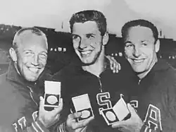 The men's discus throw was an event at the 1956 Summer Olympics in Melbourne, Australia. Twenty athletes from 15 nations competed.[1] The maximum number of athletes per nation had been set at 3 since the 1930 Olympic Congress. The qualifying round and the final both were held on Tuesday November 27, 1956.[2] The event was won by Al Oerter of the United States, the nation's second consecutive and ninth overall victory in the men's discus throw. It was the first of four straight gold medals for Oerter. The United States earned its second medal sweep in the event (after 1908), as Fortune Gordien took silver and Des Koch took bronze. Gordien became the fifth man to win two medals in the event, and the first to do so in non-consecutive Games (silver in 1948, fourth place in 1952). Italy's three-Games medal streak in the event ended.
