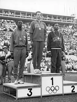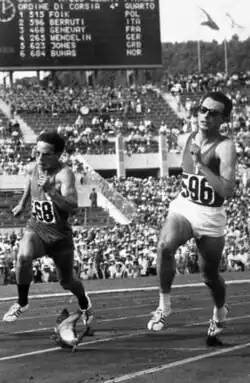 The men's 200 metres was held on 2 September and 3 September as part of the athletics at the 1960 Summer Olympics, which were held in Rome. 74 athletes from 54 nations entered, but only 62 athletes from 47 nations ultimately competed.[1] The maximum number of athletes per nation had been set at 3 since the 1930 Olympic Congress. The event was won by 0.1 seconds by Livio Berruti of Italy, the first victory in the event by a nation outside of North America and snapping a five-Games winning streak (and two-Games medal sweep streak) by the United States. The Americans finished with a silver medal, by Lester Carney, to extend their medal streak to six Games. Abdoulaye Seye of France took bronze. Berruti's gold and Seye's bronze were the first medal for their nations in the men's 200 metres.