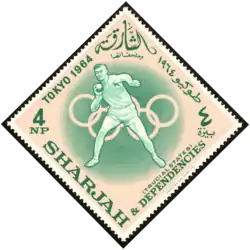 ![]() Men's shot put at the 1964 Olympics on a stamp of Sharjah | ||||||||||