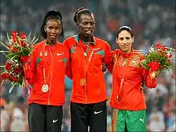This would be the last Olympic appearance by Maria Mutola, a string which started with her as a 15 year old in the 1988 Olympics, a perennial finalist since 1992. In the final, both Kenyan athletes went to the front, with World Champion Janeth Jepkosgei taking the front and teenager Pamela Jelimo following. Coming out of the break, Kenia Sinclair in lane 3 squeezed quickly into lane 1, shutting the door on Mutola. Just before the bell, Jelimo passed Jepkosgei and set off on her own. Jepkosgei gave chase but the gap just continued to widen all the way to the finish. Jelimo and Jepkosgei never saw a challenge to their gold and silver, behind them Sinclair, then Mutola gave an ever futile chase. From almost the back of the pack, Hasna Benhassi moved forward through the turn. Coming off the turn, Mutola was making her move on Sinclair and Benhassi was making her move on Mutola, the three athletes lined up shoulder to shoulder. Benhassi had the speed while the other two struggled. After being passed by Benhassi, Tatiana Andrianova followed her around the slowing athletes. While Andrianova was faster down the straightaway, she couldn't make up enough ground, Benhassi finishing with bronze after taking silver in the previous three major championships.