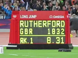 The men's long jump competition at the 2012 Summer Olympics in London, United Kingdom was held at the Olympic Stadium on 3–4 August.[1] Forty-two athletes from 30 nations competed.[2] The event was won by 15 cm by Greg Rutherford of Great Britain, the nation's second gold medal in the men's long jump and first medal in the event since winning gold in 1964. Mitchell Watt won Australia's fourth silver in the event; Australia had never won gold. Will Claye returned the United States to the podium after a 2008 Games with no American finalists; it was still only the first time that the American team had failed to win the event in two consecutive Games.