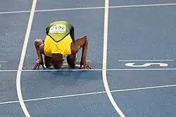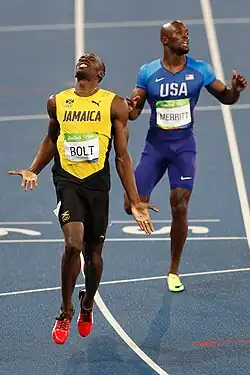 ![]() Usain Bolt and LaShawn Merritt at finish | ||||||||||