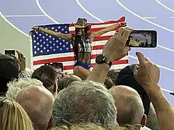 ![]() Tara Davis-Woodhall of the United States celebrates her victory in the women's long jump at the Paris 2024 Summer Olympics. | |||||||||||||