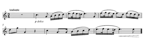 The piece is divided into two movements, marked andante and allegretto respectively. The piano accompaniment (and the piece itself) is written in B major, but the trumpet part is transposed into C major (the trumpet is a B key instrument). Only the trumpet part will be discussed here. The andante is written in 3/4 time, and was written to bring out some of the smooth and tranquil sounds of the trumpet. For examination purposes it was designed to show off the performer's ability to play a slow melody with a good sound and sensitive phrasing.[1] The andante finishes with a diminuendo-ing long pause, and then moves into the 6/8 allegretto. This section demands a flamboyant and ostentatious playing style with quick tonguing. It is written for the more exuberant side of the trumpet's personality. The piece as a whole is written in a light Spanish style, very much like Bizet's opera Carmen.[2]