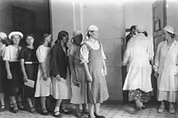 Among the Polish and Soviet female forced labour (German: Zivil- und Ostarbeiter) unintended pregnancies were common due to rampant sexual abuse by their overseers.[4] A staggering 80 percent of rapes resulting in unwanted births occurred on the farms where the Polish girls worked. The SS suspected the victims of "cheating their way out of work" by conceiving. Notably, the babies born inside concentration camps were not released into the communities.[2] For example, of the 3,000 babies born at Auschwitz, some 2,500 newborns were drowned in a barrel at the maternity ward by the German female overseers.[5][6] Meanwhile, by the spring of 1942 the arrival of trains with the girls from Poland turned into slave markets in German towns and villages, as in Braunschweig among other locations, where the young women were beaten, starved, and prohibited from speaking to each other.[7]