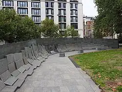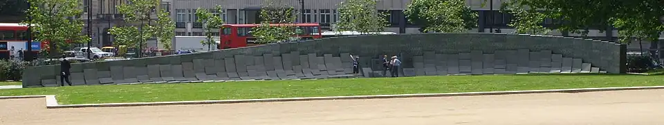 The memorial comprises a semicircular curved wall of grey-green granite slabs from Western Australia (Verde Laguna granite from Jerramungup), cut in Australia before being shipped to London. The granite stones are inscribed with the names of 23,844 towns in which the Australian soldiers were born, in Australia, the UK and elsewhere. Parts of some town names are picked out in bolder type, creating the names of 47 battles in which Australia was involved in a larger font. In summer months, water runs down over the names, intended to evoke "memories of service, suffering and sacrifice".[1] The curved wall is set facing a downwards slope of grass, forming an amphitheatre.