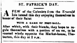 Advertisement in the Southern Australian newspaper dated 17 March 1843 for an upcoming Irish Football game to celebrate St Patricks Day.