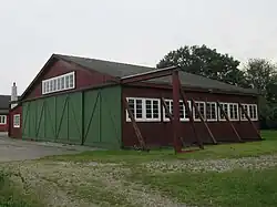The two red painted hangars from 1917 were listed in 1976.[1] They were constructed in timber so that they could easily be burned down in the event of war. The site also features an engine testing facility from 1943. Almost a hundred metres long, it consists of a row of 10 interconnected testing halls. A vintage aircraft from 1958 has been installed on the top of a column in front of the buildings.