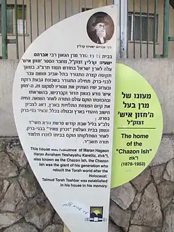 - ^ Today, Chazon Ish Street (Bnei Brak). The site houses Talmud Torah Tashbar, named after the Chazon Ish.