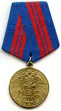 Awarded to employees of law enforcement bodies of the Russian Interior Ministry with at least 5 years of continuous service in one of the bodies of the Interior Ministry, for courage and selflessness demonstrated in the line of duty, for achieving high results in personal performance, for marked improvement of professional skills, for the development and introduction of new working methods to improve the efficiency of MVD bodies.[1][4] |