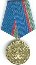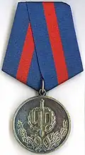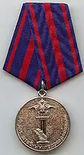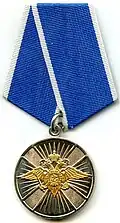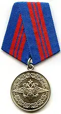 Awarded to employees of law enforcement bodies of the Russian Federation, to federal civil servants, to employees of the Interior Ministry of Russia, for high performance in service and diligence in the performance of tasks during a period of martial law, a state emergency, an anti-terrorist operation, in the context of an armed conflict, in the aftermath of accidents, natural or man-made disasters or other emergencies.[1][4][7] |