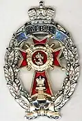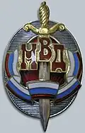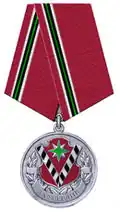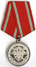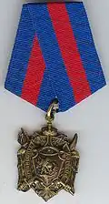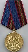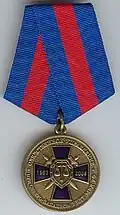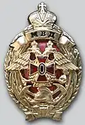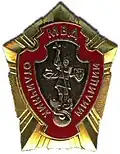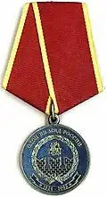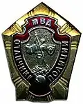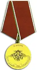 Awarded to military personnel of the troops of the Interior Ministry of the Russian Federation for excellent performance in training; for distinction in the performance of military duties; for merit in the protection of public order and public security; for courage, dedication and high achievements displayed during military service. Abrogated from the MVD awards system by order 602 of October 2013, it is no longer awarded.[19][1][2] |