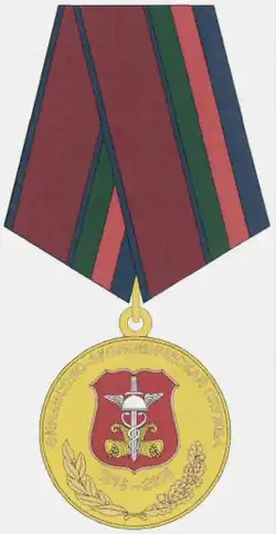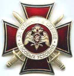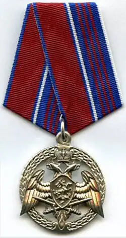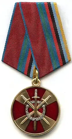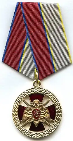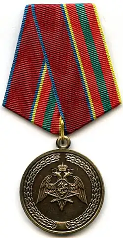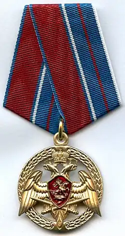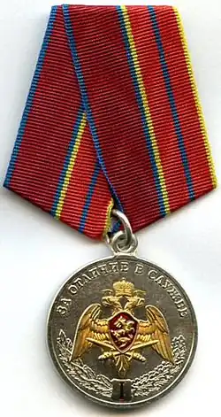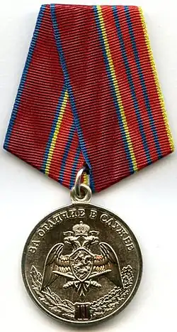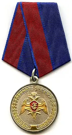 Awarded to military personnel, employees and federal civil servants of the Troops of the National Guard of the Russian Federation; for excellent performance in combat (professional, leadership) training, during professional service activities; for specific distinction, displayed military bearing in service, high performance indicators in military service (operational duty, service, combat) tasks and exercises; for high results in service and combat, in operational performance, in performance management; for achievements in the protection of public order and public security; for active work in the protection of public order, combating crime and the fight against terrorism and extremism; for bravery, dedication and other merit displayed during military service (work); for excellent and efficient civil service. The medal is awarded in 3 classes awarded successively from the lowest to the highest degree, the medal 1st class being the higher.[2][3] |