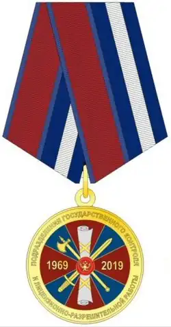 № 23 | 2019-01-23 | Awarded to military personnel, persons serving in the forces of the National Guard with special police ranks, and civilian personnel (federal state civil servants and employees) of the forces of the National Guard, who have served (worked) impeccably for three years or more in calendar terms, in the licensing and permit units of organs of the Ministry of Internal Affairs of Russia and the National Guard; to citizens discharged from military service to the reserves (retirement), who have made a significant contribution to the performance of tasks and the exercise of the powers assigned to licensing and permit units; to persons assisting in the performance of tasks and the exercise of the powers vested in the licensing and permits units.[9] |