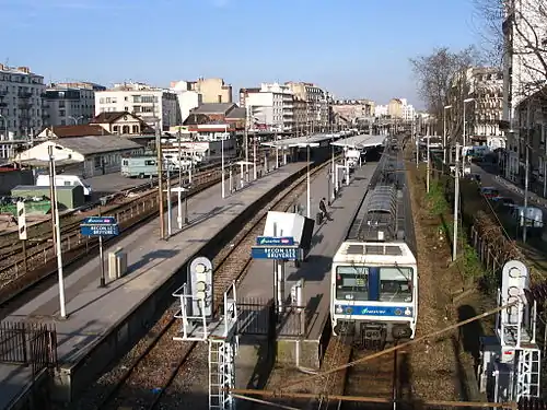Bécon-les-Bruyères station (French pronunciation: [bekɔ̃ le bʁɥijɛʁ]) is a railway station in the town Courbevoie, Hauts-de-Seine department, in the northwestern suburbs of Paris, France. It is on the railway lines from Gare Saint-Lazare to Versailles and to Saint-Germain-en-Laye, and is served by Transilien Line L.