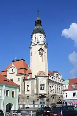 The town hall is a main landmark of the Mírové Square in the historic town centre. It is an Art Nouveau building, built in 1908–1911.[4] The Marian column and the fountain on the square are from the second half of the 17th century.[5]