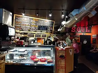 Focusing on Southern-style cuisine,[11] the menu offers natural grass-fed beef, chicken, pork, and other meats that have been dry-rubbed and slow-smoked for up to 14 hours with local apple and hickory woods. Treitman makes his sauces and his own ketchup from scratch.[5]
